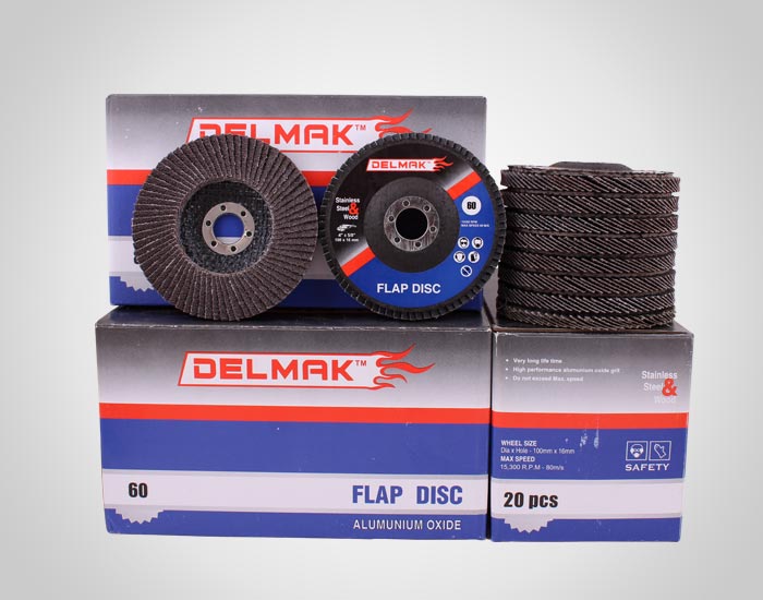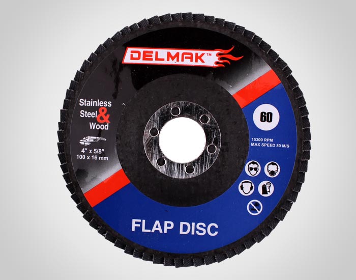 DELMAK Flap Discs are created by overlapping coated abrasives flaps and attaching them firmly over a cloth backing to form a fan like configuration, thus creating a design that provides a cooler running, longer lasting disc. A very consistent finish is provided during life of the disc because new layers of abrasive are constantly being exposed. These Discs are specifically recommended for high stock removal on stainless steel, carbon steel, aluminum and Wood.